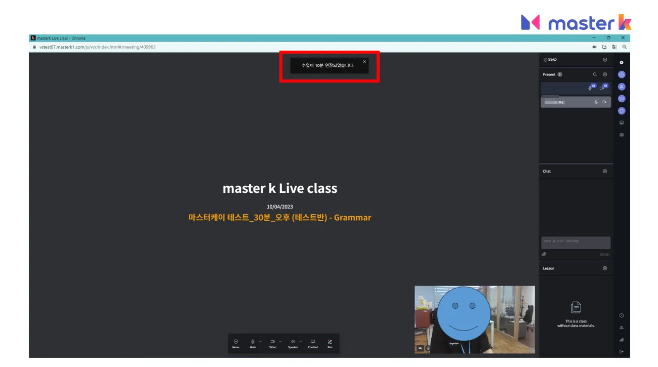10분 연장 버튼을 클릭하여 현재 수업의 종료 시간을 10분 연장합니다.