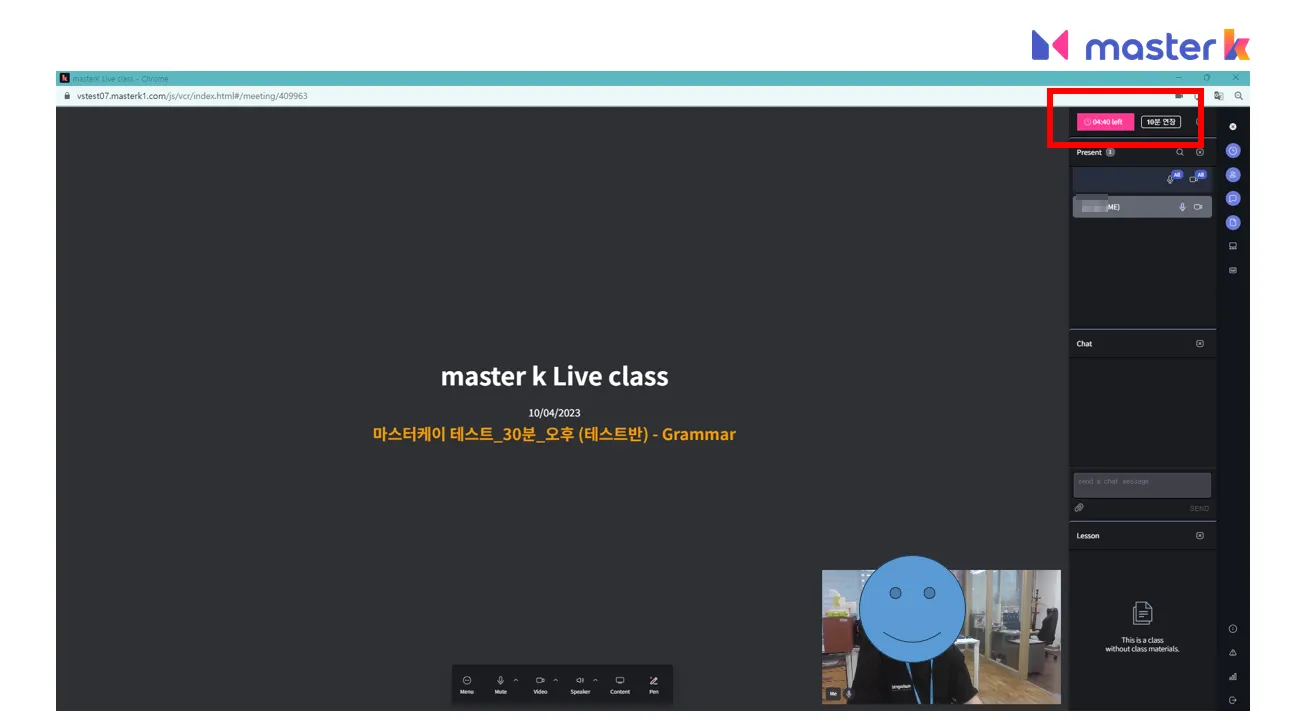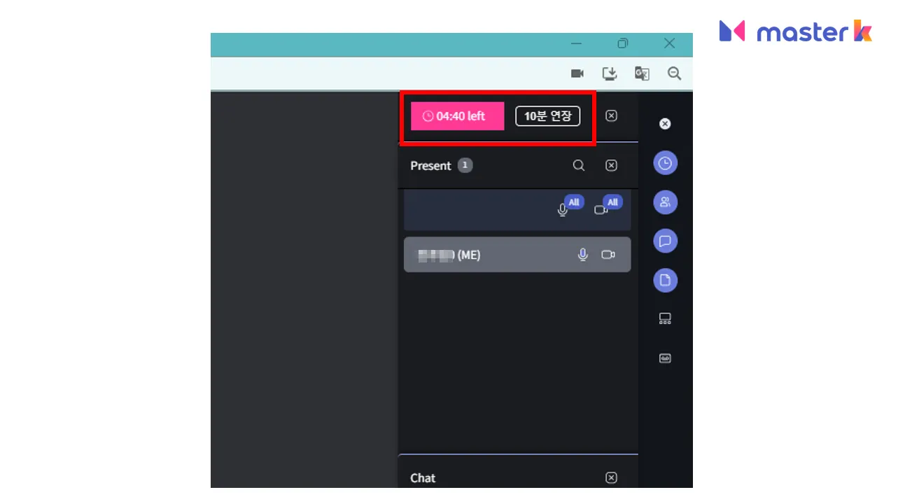 수업 종료 5분 전이 되면 수업 시간 텍스트에 분홍색으로 표시가 되며, 남은 시간이 표시됩니다. 그리고 오른쪽에 10분 연장 버튼이 표시됩니다.