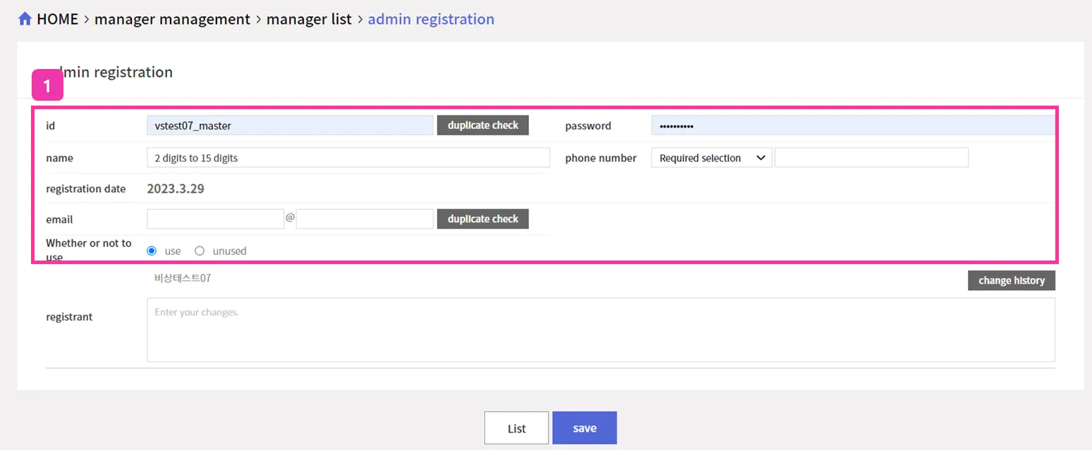 관리자 등록을 누르면 관리자 계정을 등록할 수 있고,