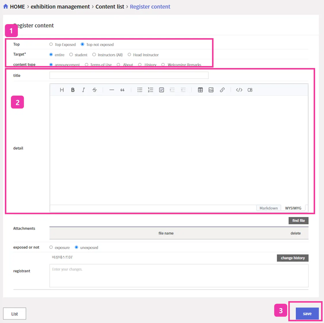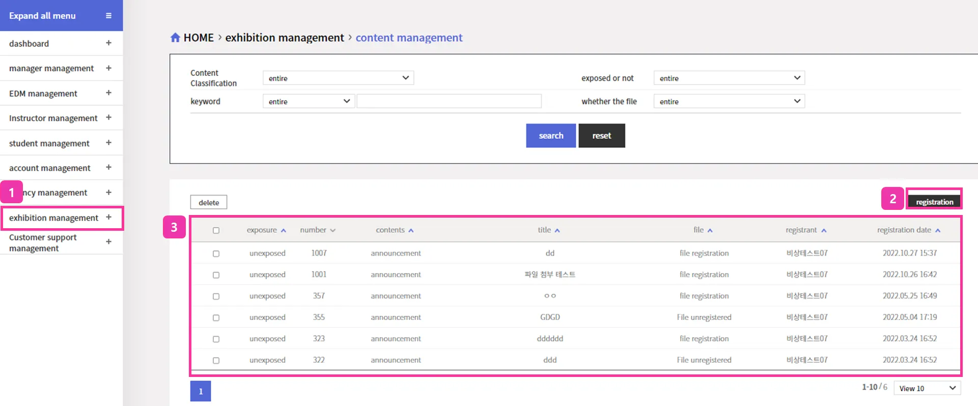 Click [Exhibition Management] on the admin page and then click [Content Management].