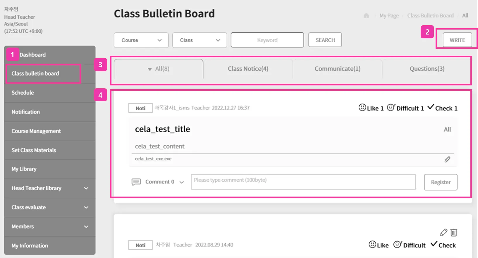 [All] shows all posts, [Class Notice] shows the notices posted by the teacher, [Communication] allows students to freely post, and [Questions] shows questions asked by students to the teacher.