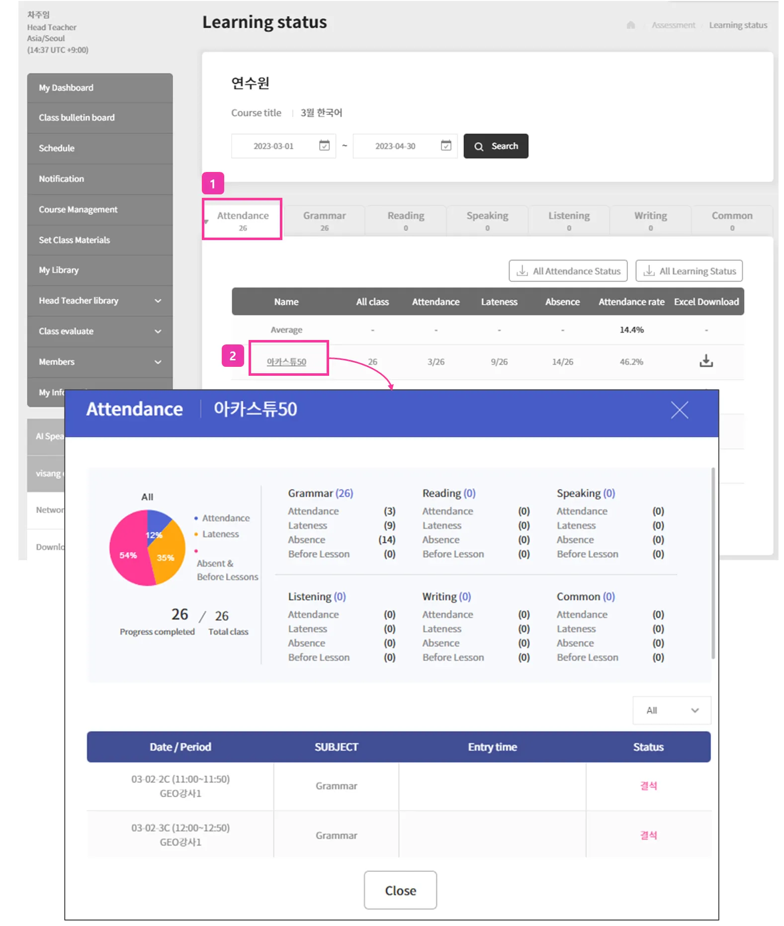 Attendance status를 누르면 학생 출결 현황이 나와요.