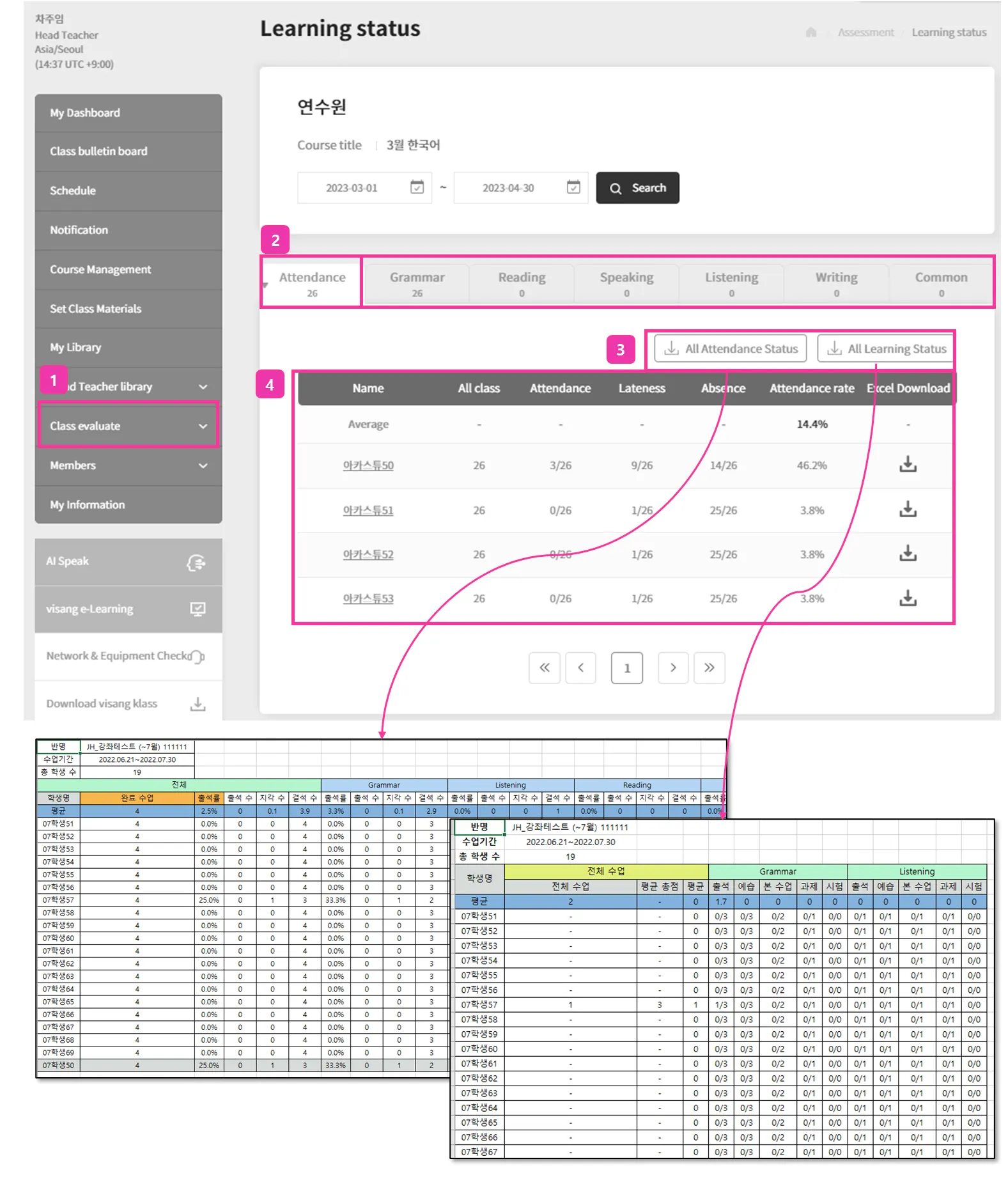전체 출결현황과 전체 학습현황을 엑셀로 다운로드 받을 수 있어요.