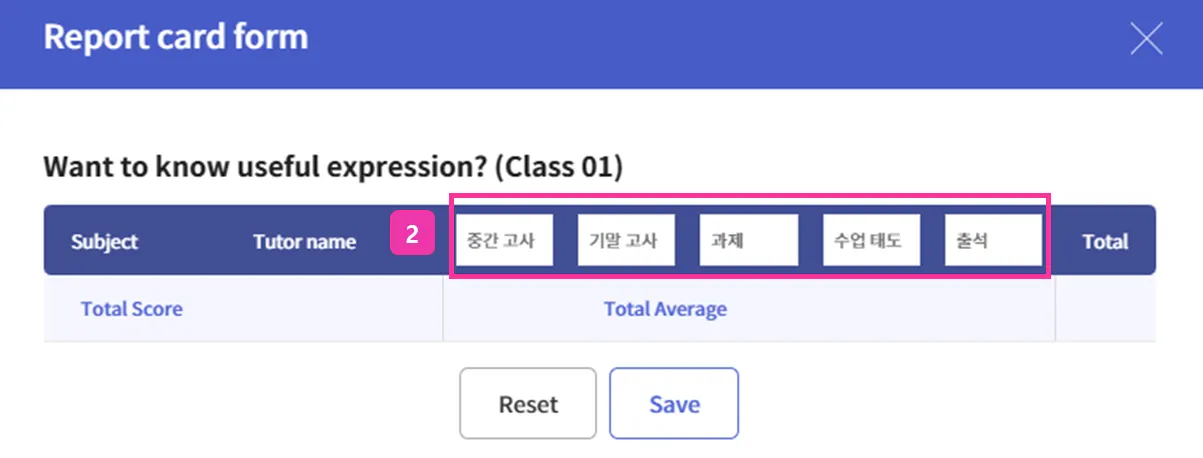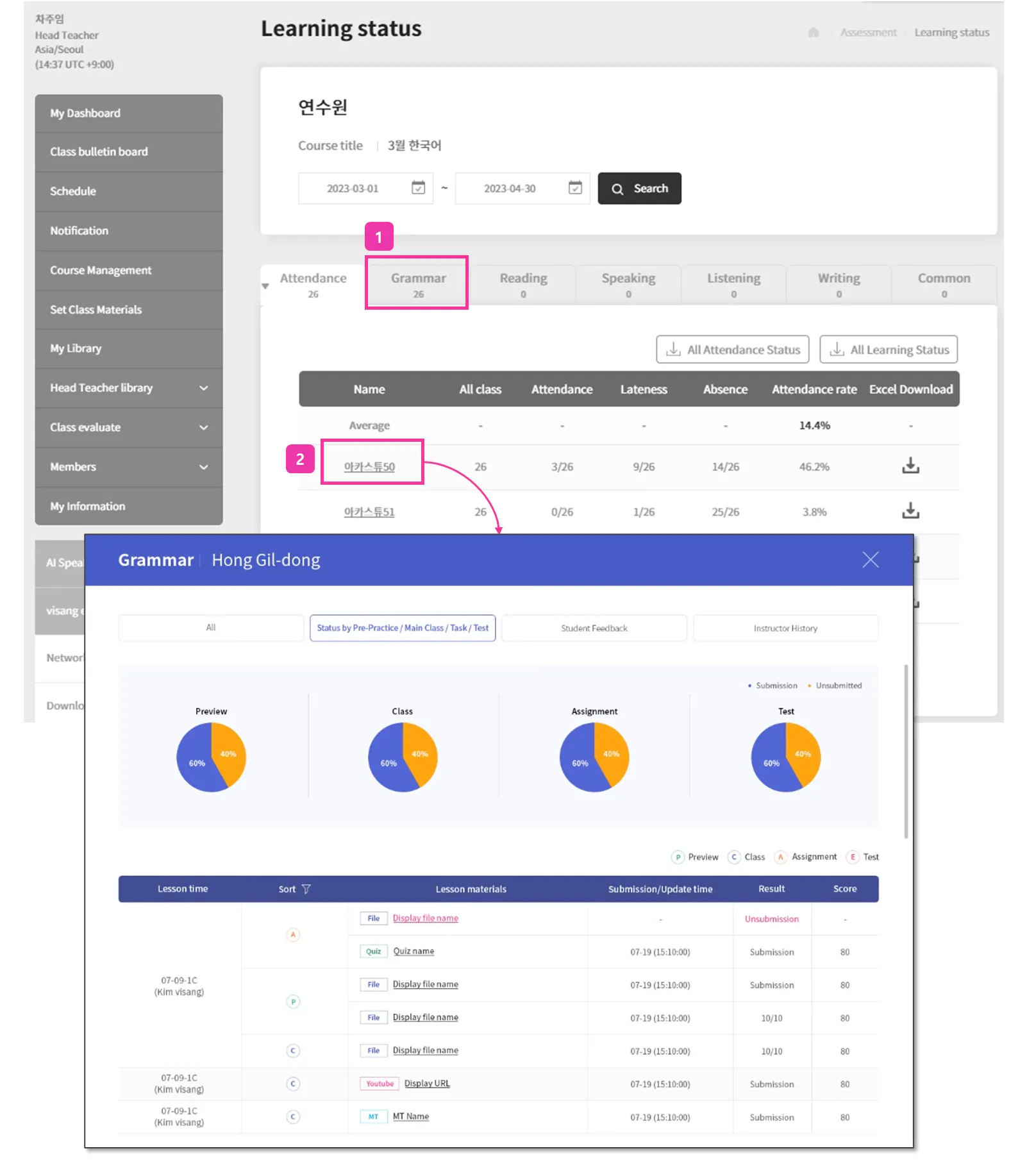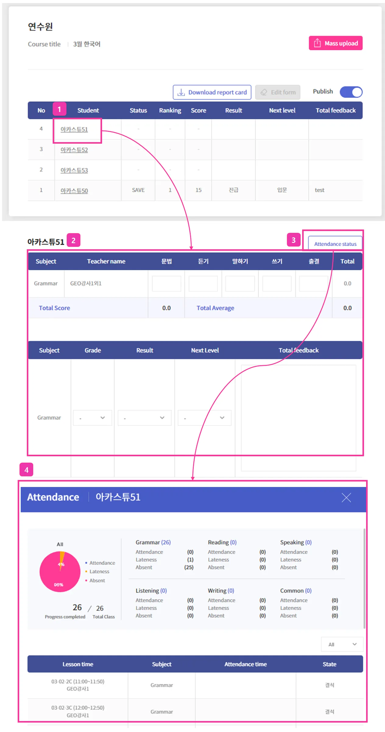 주임강사는 모든 학생의 학습현황을 확인하고 성적표를 만들 수 있어요.
