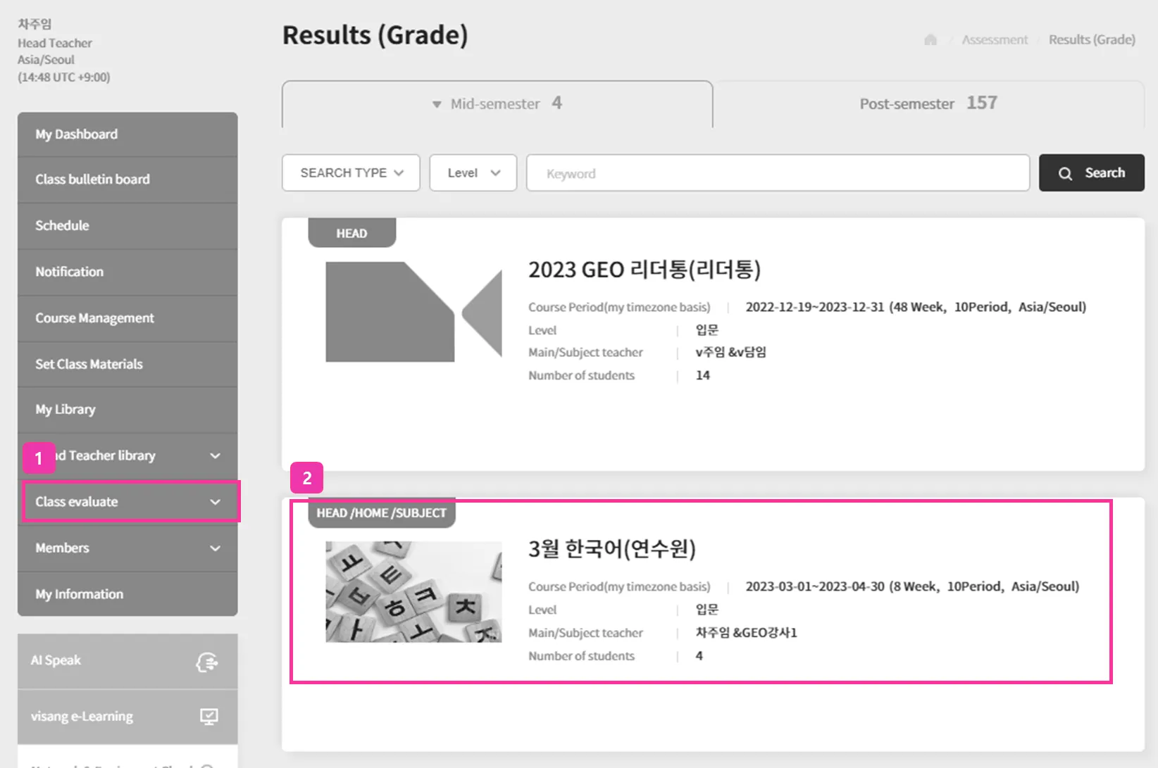 [수업 평가 → 학습현황]으로 이동한 후 해당 강좌를 클릭해요.