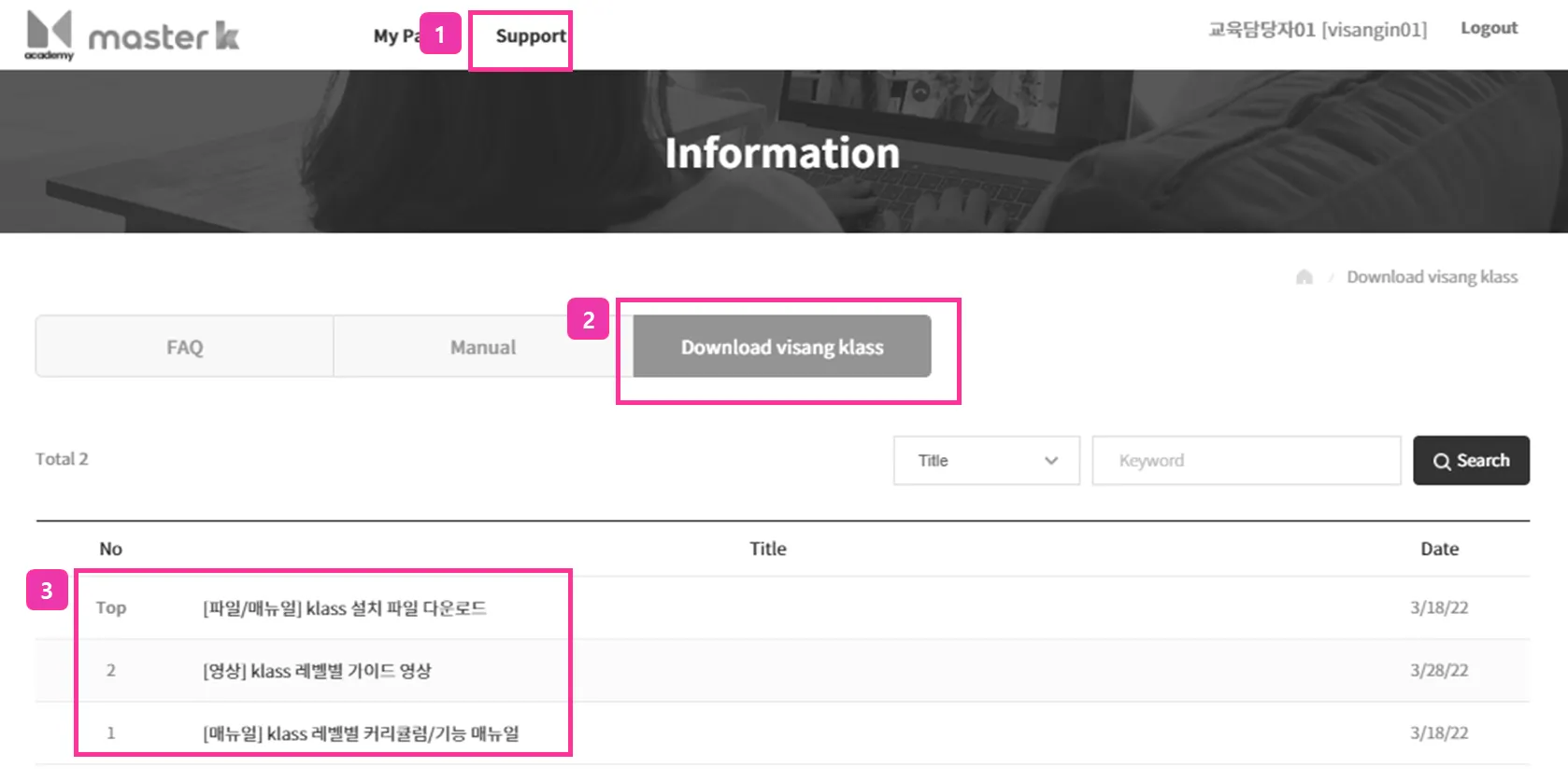 When you log in with your teacher account, there is a [visang klass download] menu in [Support].