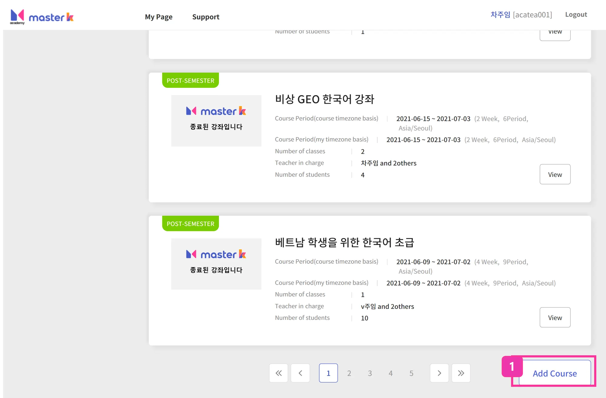 Stand by(학기전) ,Mid semester(학기중) , Post semester(학기종료) 별로 강좌 리스트를 확인할 수 있어요.