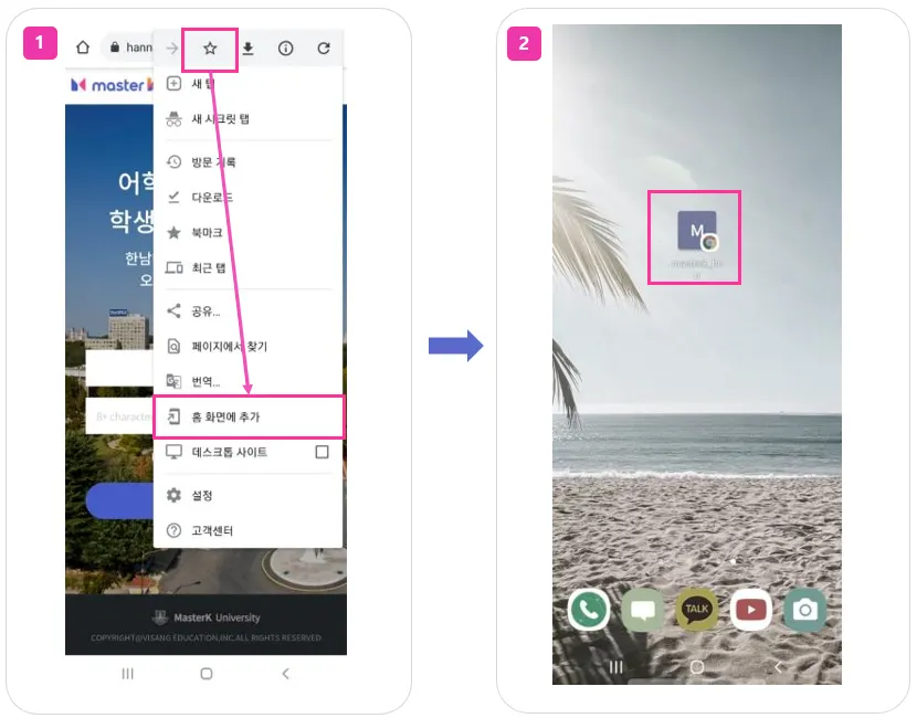 브라우저 상단 즐겨찾기 버튼 클릭 후 홈 화면에 추가 버튼을 클릭해주세요.