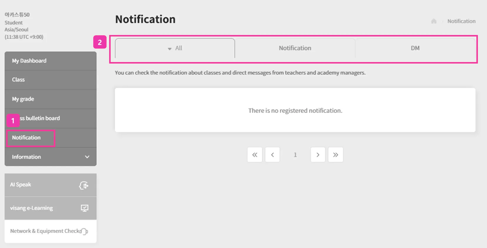 학생은 [마이페이지]를 누르고 왼쪽 [알림]을 눌러서 선생님이 보낸 DM을 볼 수 있어요.