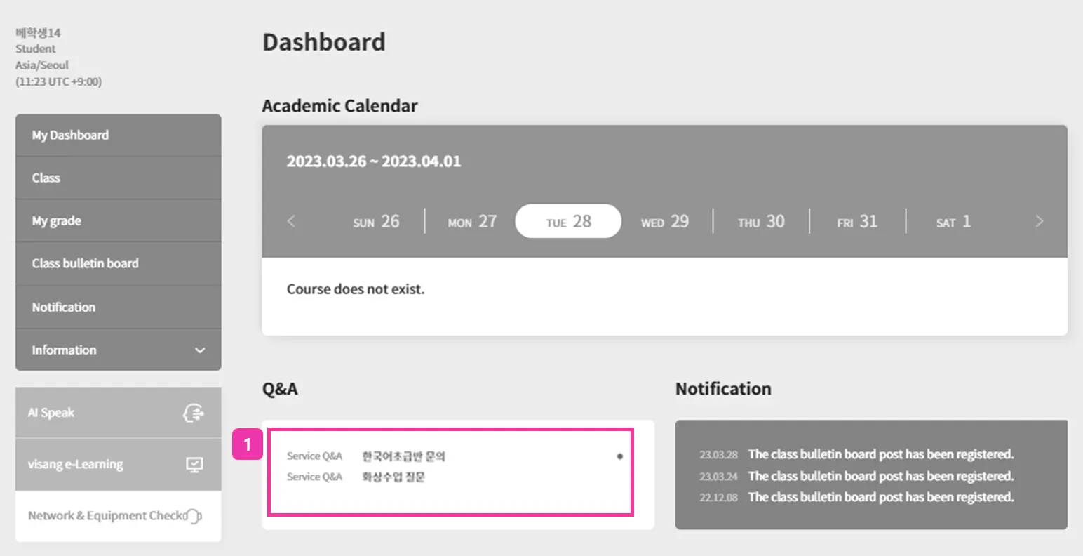 내가 올린 [수업 질문]이나 [서비스 문의]에 댓글이 생기면 대시보드에서 ● 표시를 확인할 수 있어요.