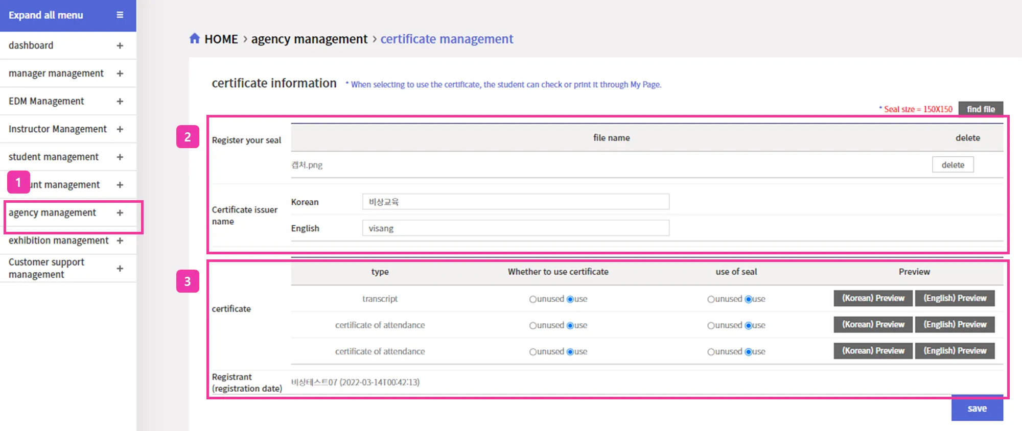 To issue a certificate, you must enter a 'seal' and 'text' on the admin page.