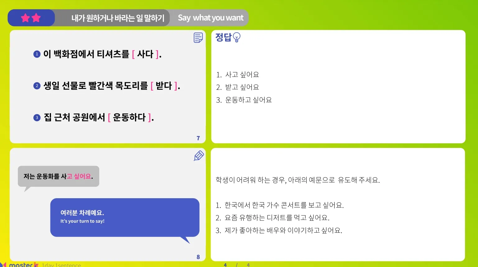 저는 운동화를 사고 싶어요. 저는 커피를 마시고 싶어요. 저는 집에 가고 싶어요. (....?) 등 한국인들이 일상 속에서 자주 쓰는 문장을 보고 다음 페이지에 있는 구조도로 사용된 한국어 문법을 이해합니다.