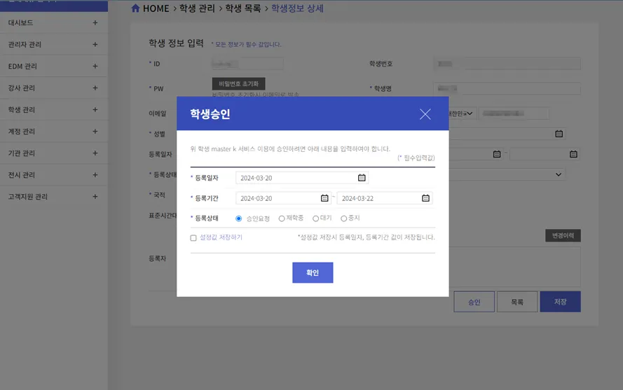 [승인] 버튼 선택 시 ‘학생 승인’ 팝업 노출