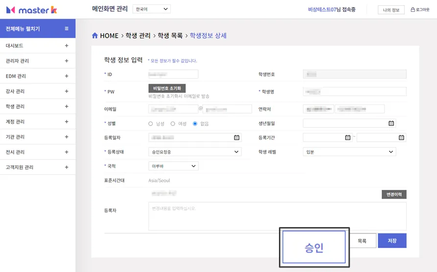 (기관에서 승인 처리하지 않은 경우 학생 상태 값 중 ‘대기’와 유사하며 학생은 홈페이지에 로그인이 되지 않아 수업에 진입할 수 없습니다.)