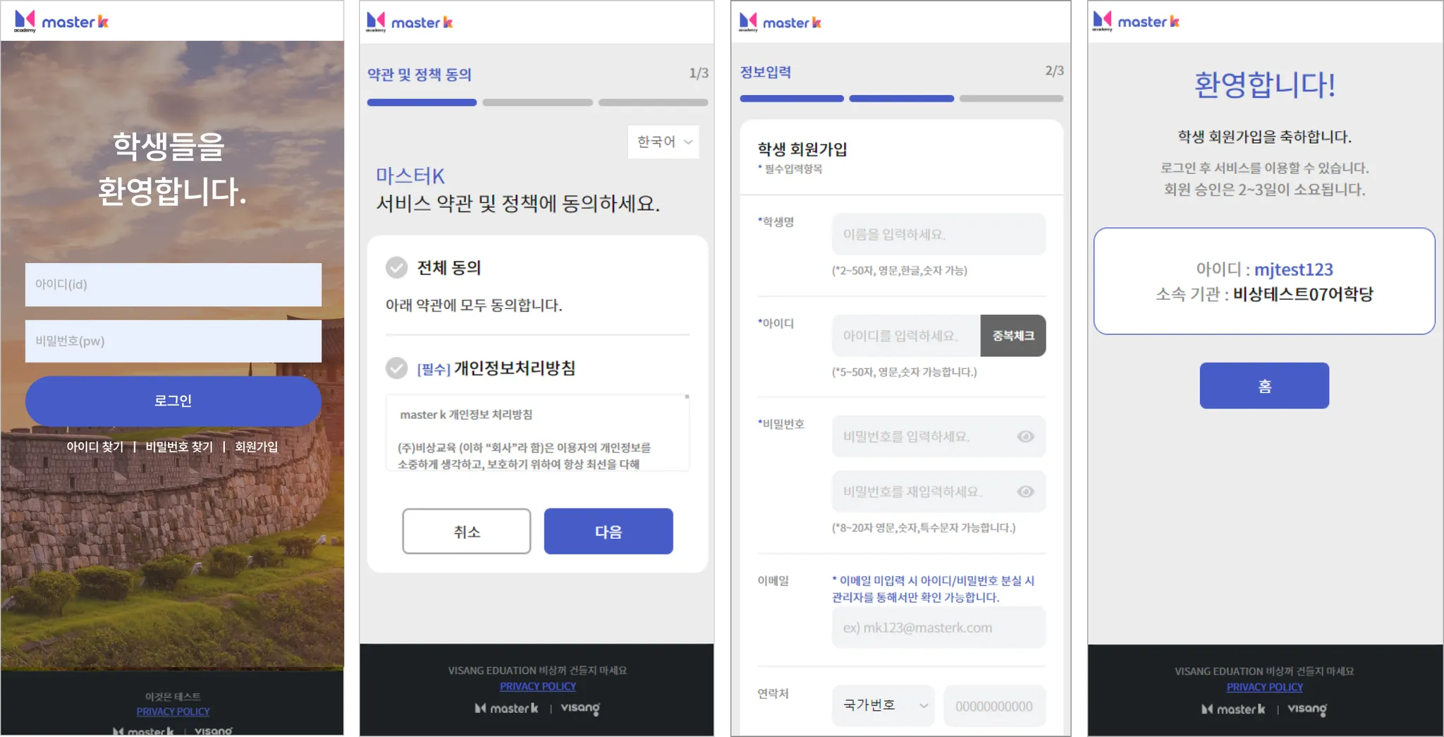 이번 업데이트에서는 학생들이 직접 master k 서비스에 가입할 수 있는 회원 가입 기능을 추가하였습니다.