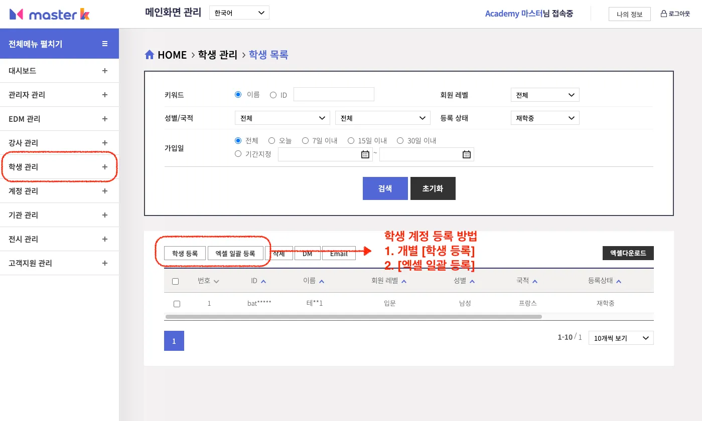 답변: 아카데미 사이트에서 직접 학생이 회원 가입 → 기관 관리자 페이지에서 회원 [승인]