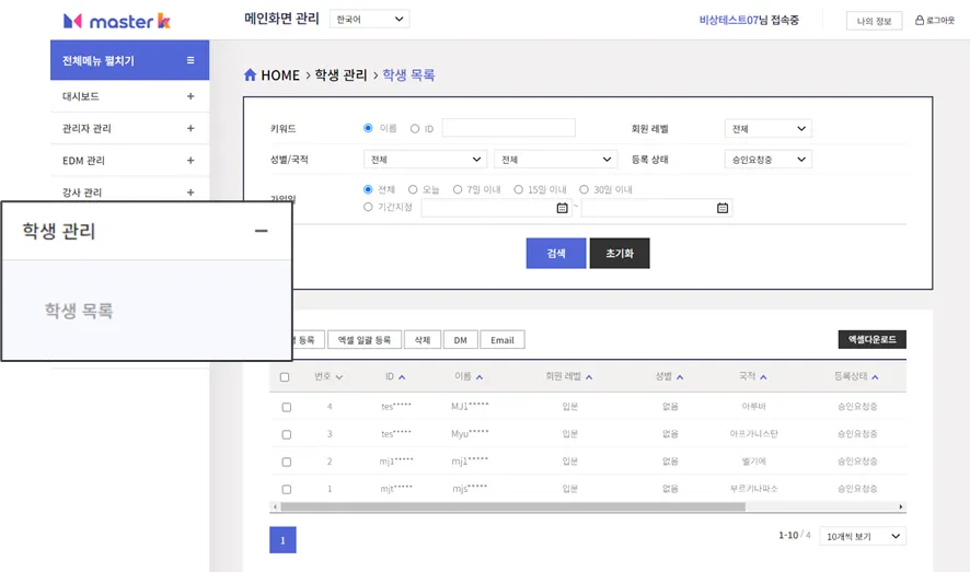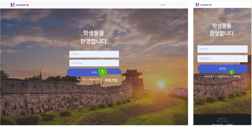이전에는 master k 서비스 이용 시 기관에서 직접 계정 관리를 하셨었는데, 기관의 규모에 따라 학생 계정을 매번 등록 및 관리하는 번거로움이 있어 개선하게 되었습니다.