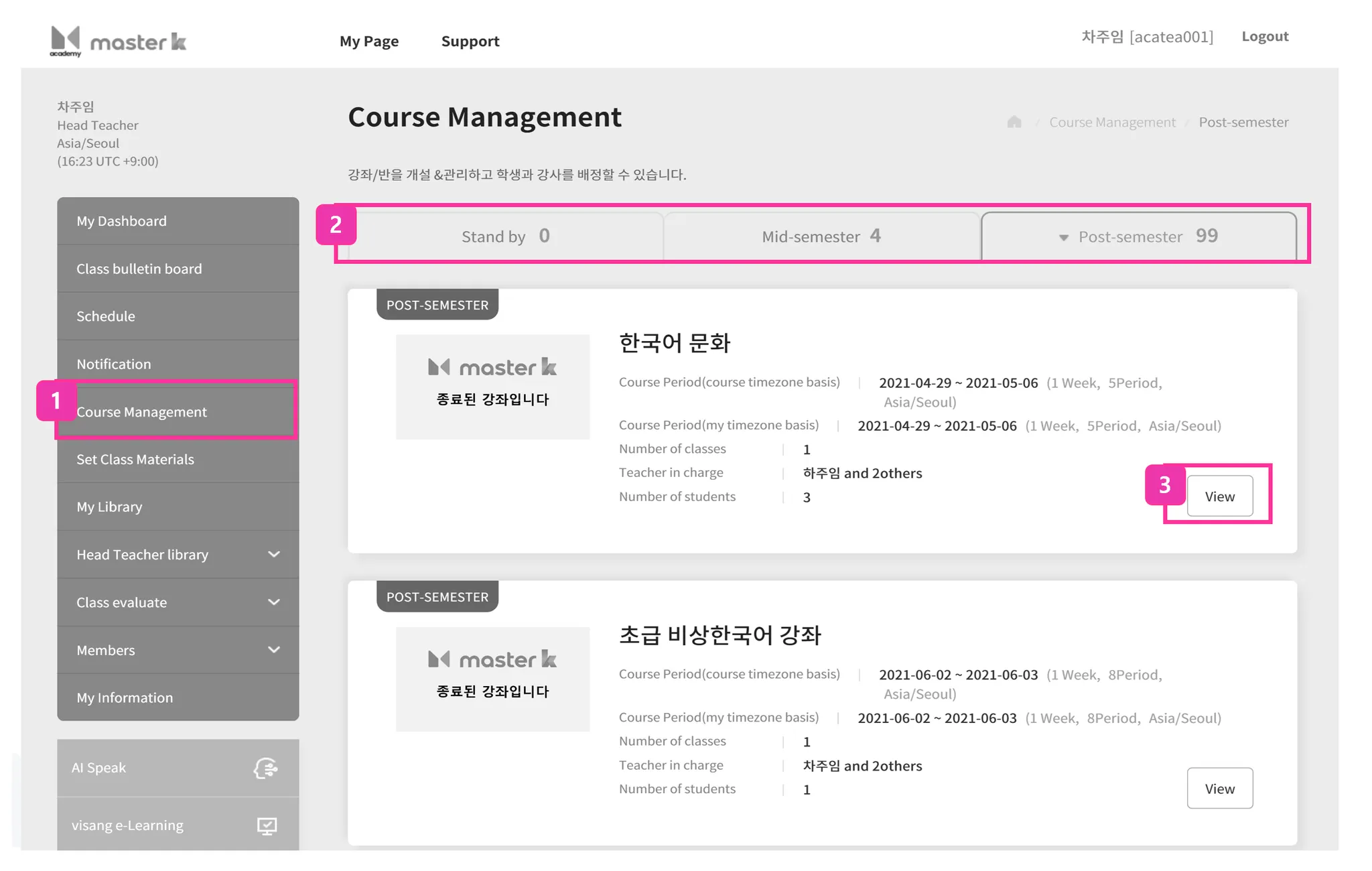 You can check the course list by Stand by (pre-semester), Mid-semester, and Post-semester categories.