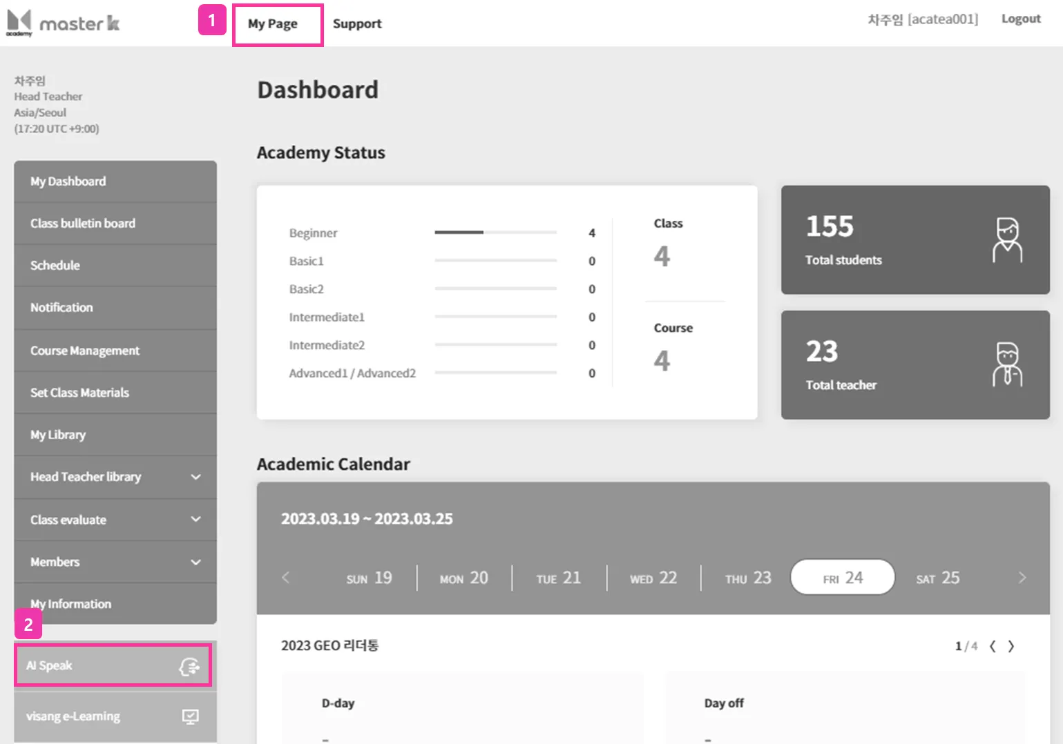 Log in to the master k language school. Click on [My Page].